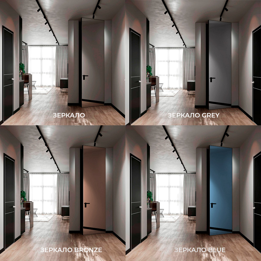 Полотна: с одной стороны сплошное зеркало, обратная сторона: однотонный скин, древесное покрытие, под покраску на ваш выбор. Кант по периметру: в полотнах МА 8 мм, в полотнах М 4 мм.